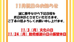 さて、11月の祝日についてお知らせです。11/3と11/24は終日休診となります。